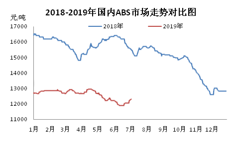 2019年上半年國內(nèi)ABS塑料市場震蕩運行后深跌再小漲,以余姚市場0215A為例,1-6月份價格運行區(qū)間在11900-12950元/噸。